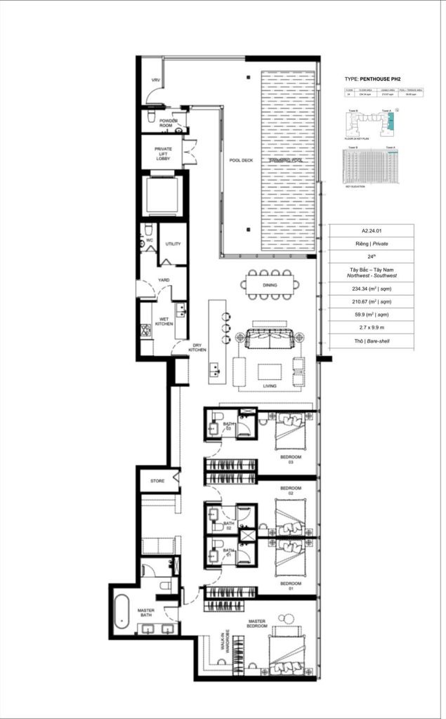 - Penthouse diện tích 234m² – thiết kế trải dài nguyên một sàn, tối ưu không gian sống riêng tư tuyệt đối