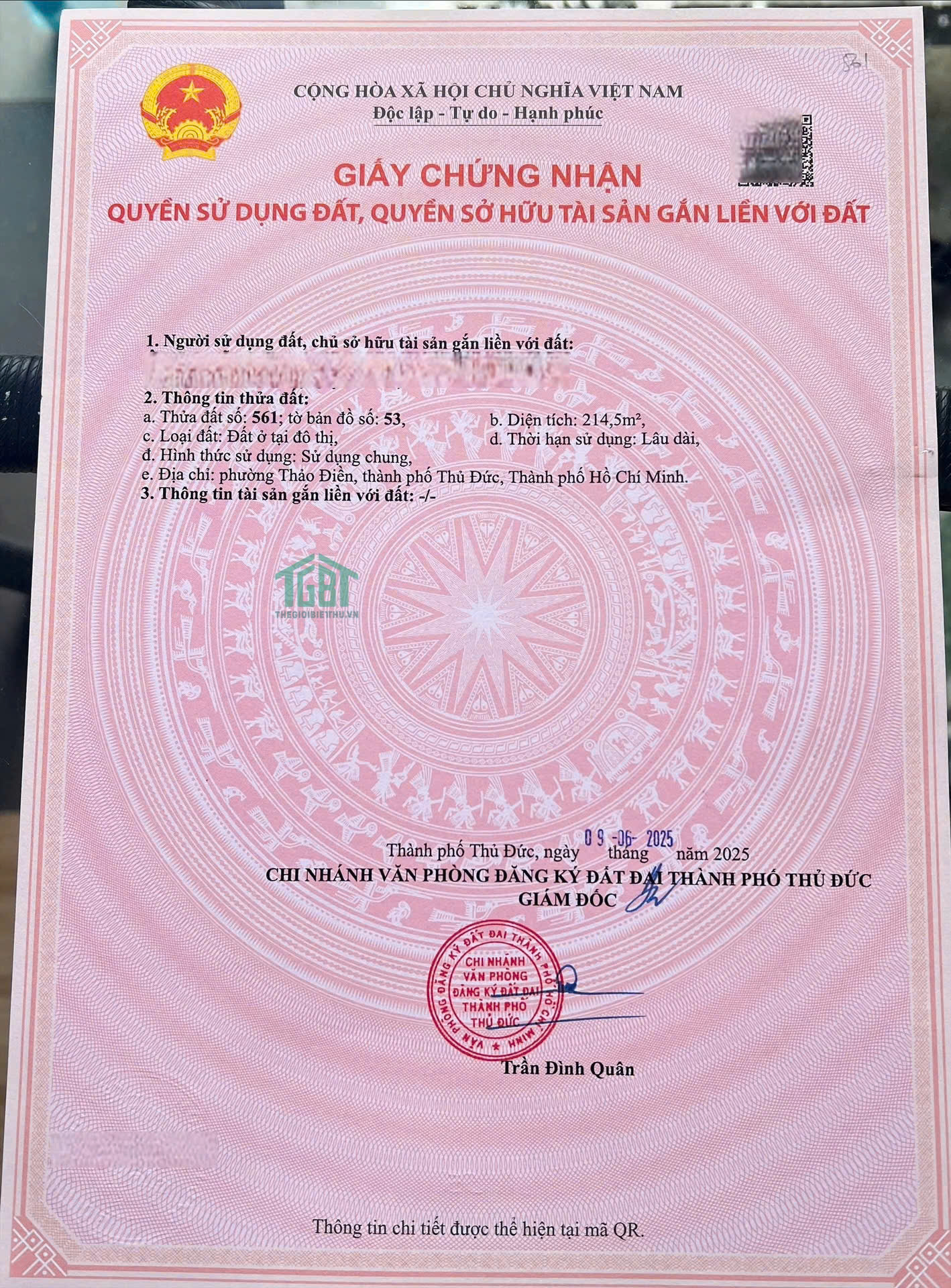 Khu đất diện tích sử dụng 224m2 có 214.5m2 thổ cư, đất đẹp vuông vắn