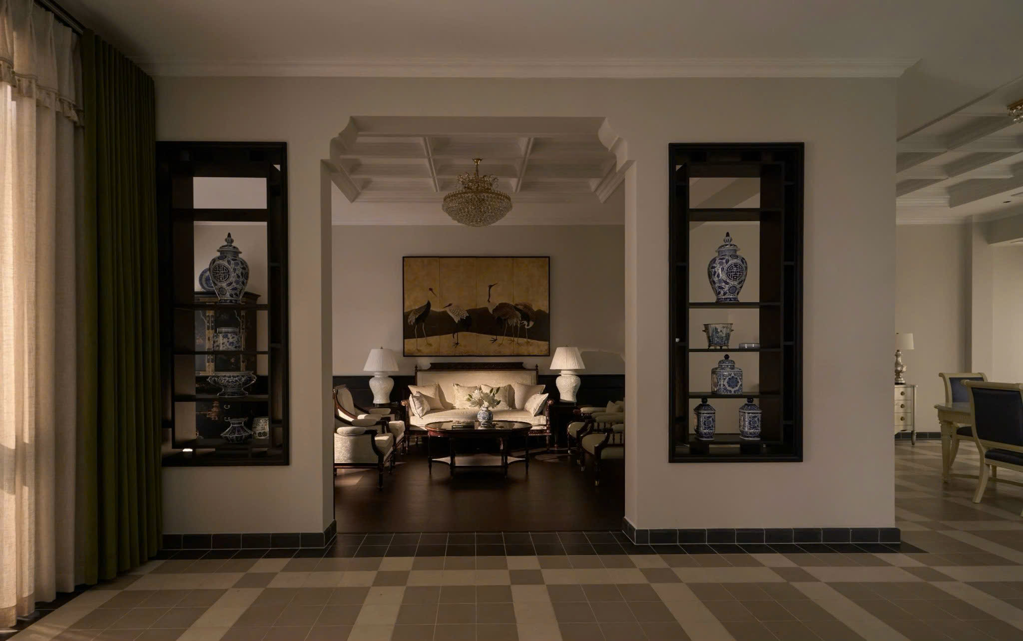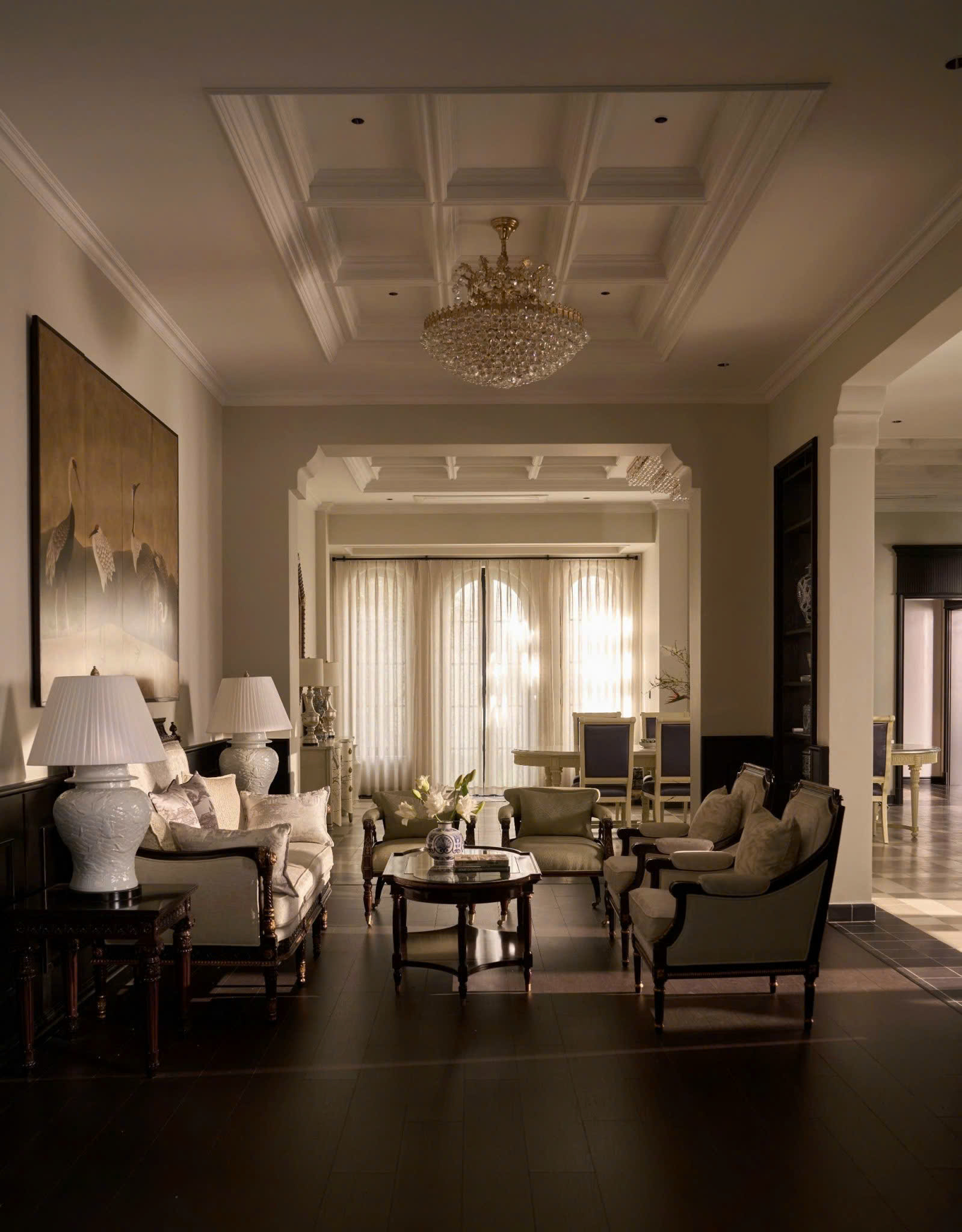 Điểm nhấn nghệ thuật là tranh chim hạc giữa phòng khách và các chi tiết gốm sứ xanh trắng, biểu trưng cho sự cao quý, thịnh vượng và gu thẩm mỹ tinh hoa. Trần cao, phào chỉ tinh xảo cùng ánh sáng vàng dịu mang lại cảm giác bề thế và ấm cúng.